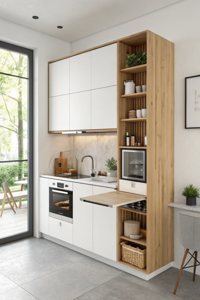 The fold-down mini kitchen is engineering genius for ultra-small spaces. When closed, it looks like a sleek cabinet; when opened, it reveals a complete cooking station with cutting board, burner, and storage.