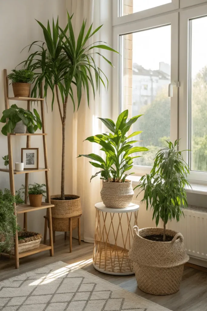 Start with easy-care varieties like pothos, snake plants, or ZZ plants if you’re new to plant parenting. Create visual impact by grouping plants of different heights together, placing tall floor plants in corners, medium plants on side tables, and small succulents on shelves. Use attractive planters in ceramic, terracotta, or woven baskets that complement your decor style.
