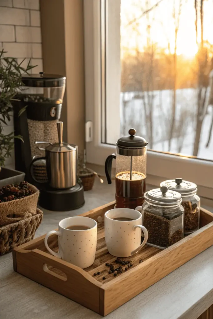 Choose mugs in warm colors or textured ceramics. Add a small plant, candle, or wooden tray to complete the look. This setup encourages slow moments and makes winter mornings and evenings feel more comforting.