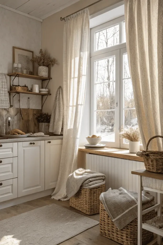 Textiles soften hard surfaces like cabinets, countertops, and floors, making the kitchen feel more comfortable and lived-in during winter.