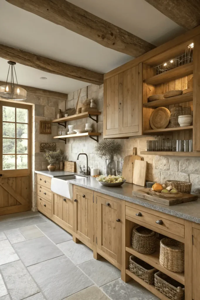 You can lean wooden cutting boards against the backsplash or display them on open shelving. A wooden fruit bowl or bread box adds both function and style. If your kitchen allows, adding a wooden stool or bench enhances the cozy feel even more.