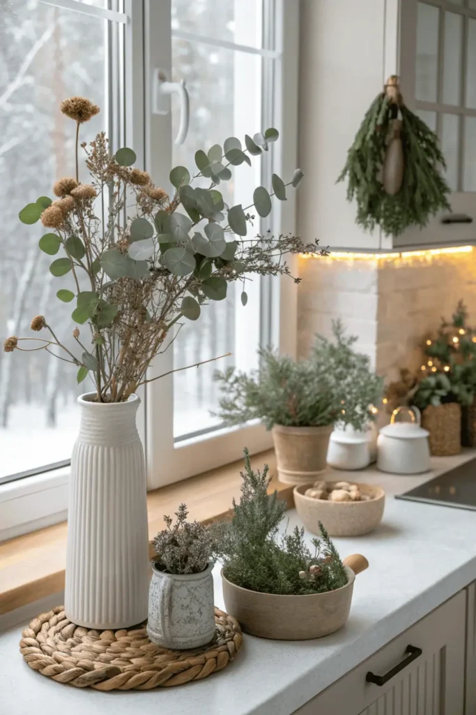 Plants are not just for spring and summer. In winter, greenery adds life and freshness to your kitchen. Opt for hardy plants like rosemary, eucalyptus, pine branches, or small potted herbs.