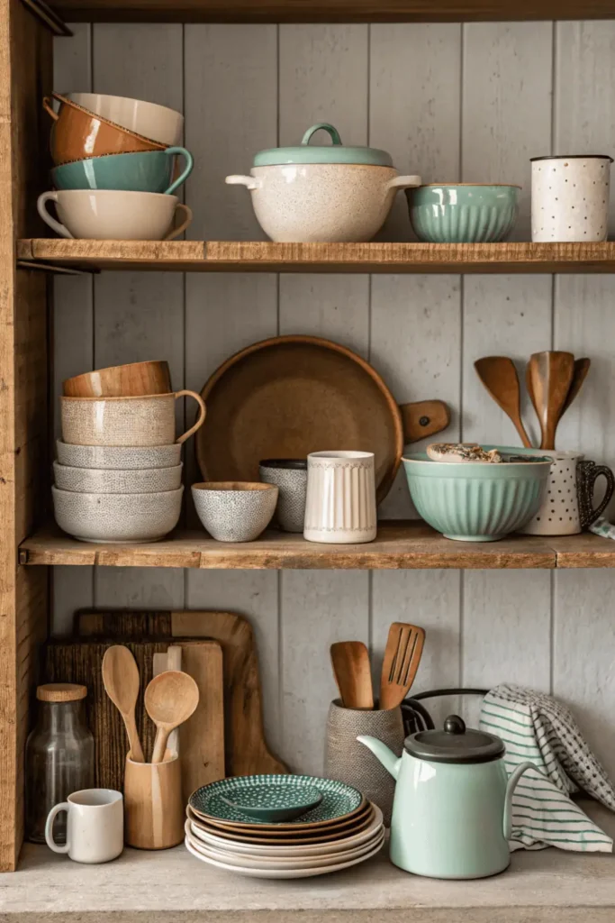 Open shelving or hanging pot racks allow you to display these items in a functional yet decorative way. Choose pieces in warm tones like cream, rust, deep green, or earthy brown.