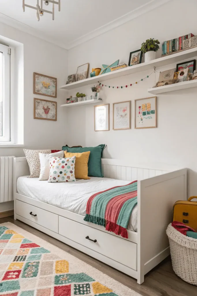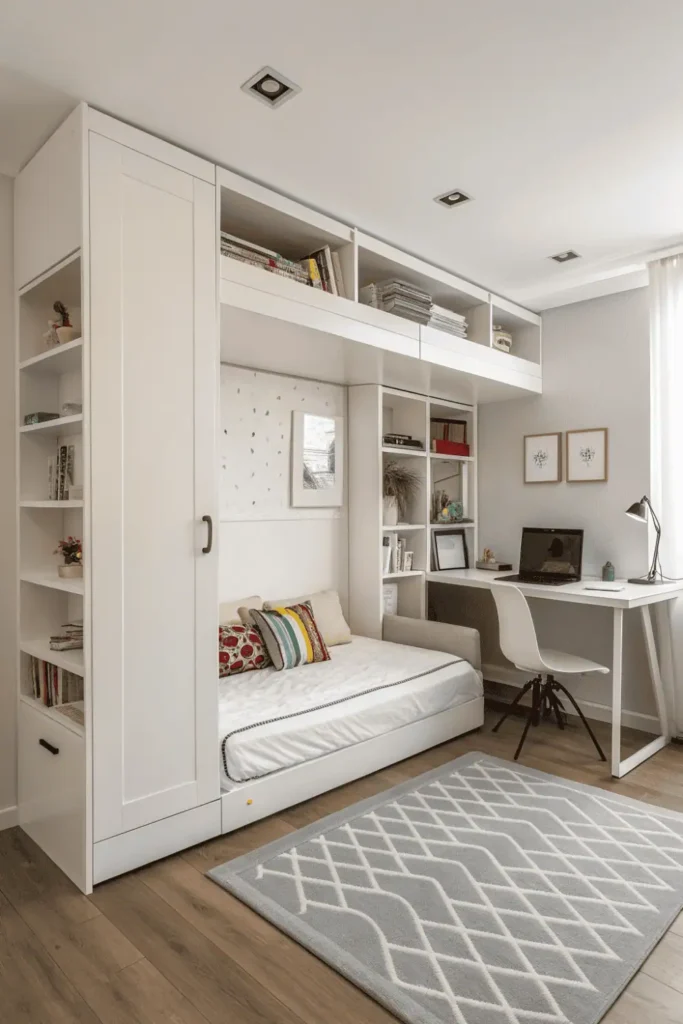 Murphy beds fold vertically against the wall when not in use, creating dramatic space savings in a kids room bed setup. This innovative solution works beautifully in very small bedrooms or multi-purpose spaces.
