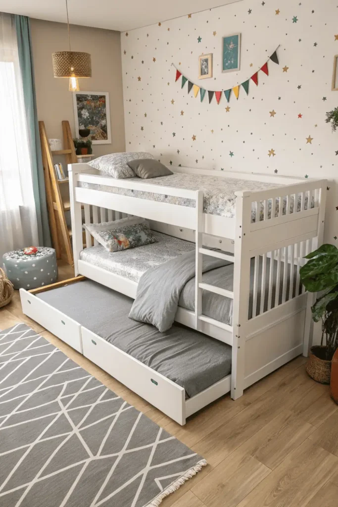 A trundle-style kids room bed hides a second sleeping surface underneath the main bed frame. During the day, it looks like a standard twin bed, but it rolls out effortlessly for overnight guests.