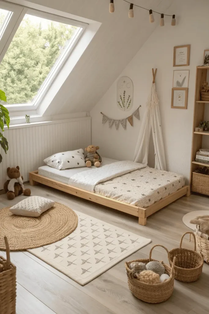 Montessori floor beds sit directly on the floor or use minimal frames just inches high. This child-centered approach promotes independence by allowing even toddlers to get in and out without adult help.