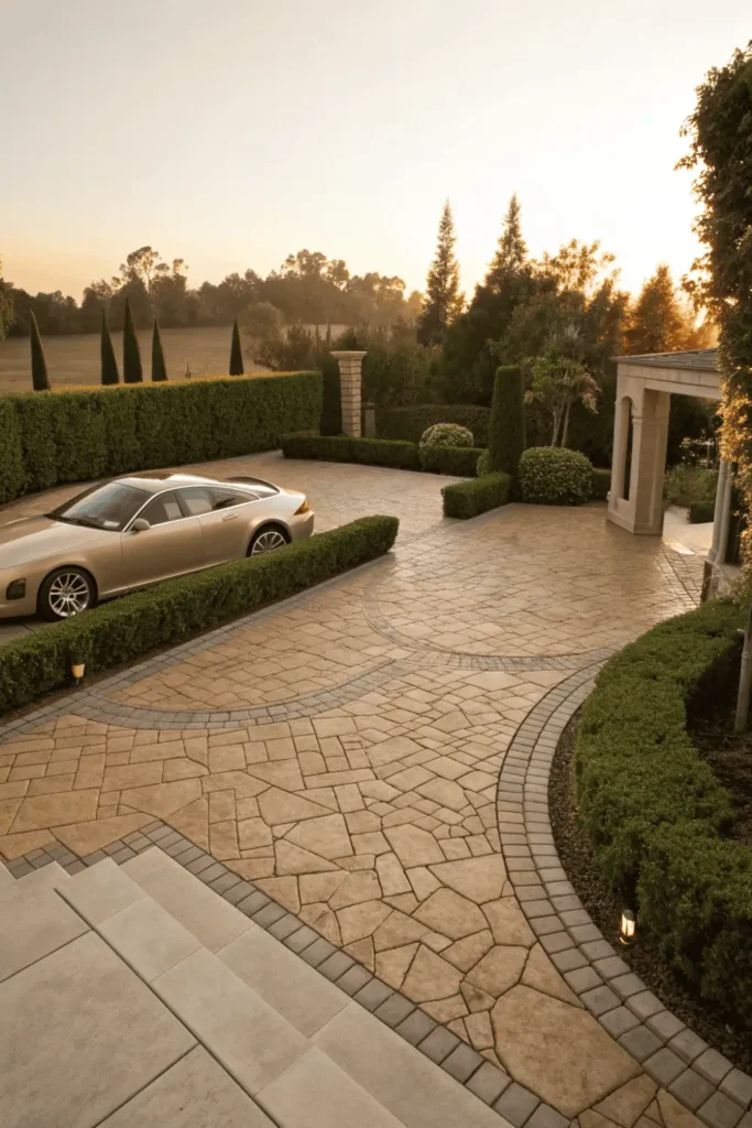 Strategic gaps between stones accommodate low-growing ground covers like creeping thyme or Irish moss, adding color and softness. This design works beautifully for side parking areas or courtyards adjacent to formal gardens.