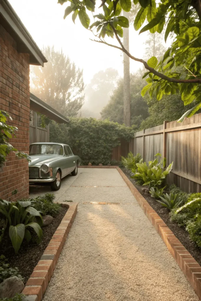 Defined borders using brick, stone, or steel edging prevent gravel migration into garden beds and create clean visual lines. Choose stabilized gravel or larger stones (3/4 inch) that compact well under vehicle weight.