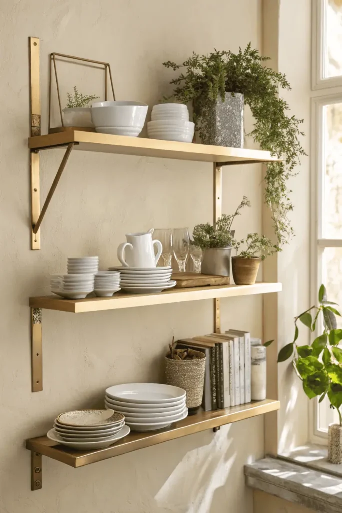 Pro Tip: Style gold shelves with a mix of cream and white dishes, gold-rimmed glassware, small plants, and cookbooks—arrange items in groups of three for the most pleasing visual composition.