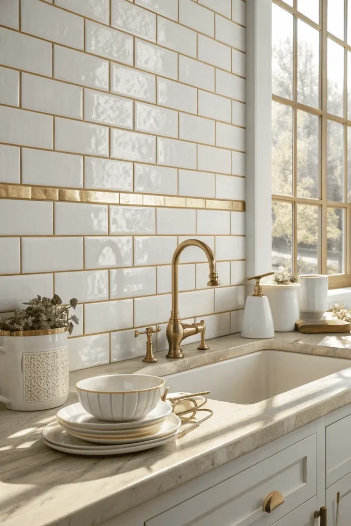 The gold grout creates a jewelry-like effect that catches light and adds texture to your walls. This approach allows you to incorporate cream-and-gold kitchen ideas through an element that’s both practical and beautiful.