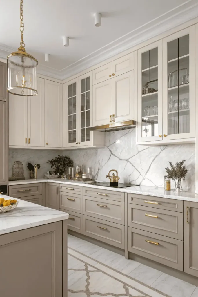 Pro Tip: Paint lower cabinets in warm taupe, soft gray, or sage green to complement cream uppers while providing grounding contrast—then unify both with matching gold hardware.