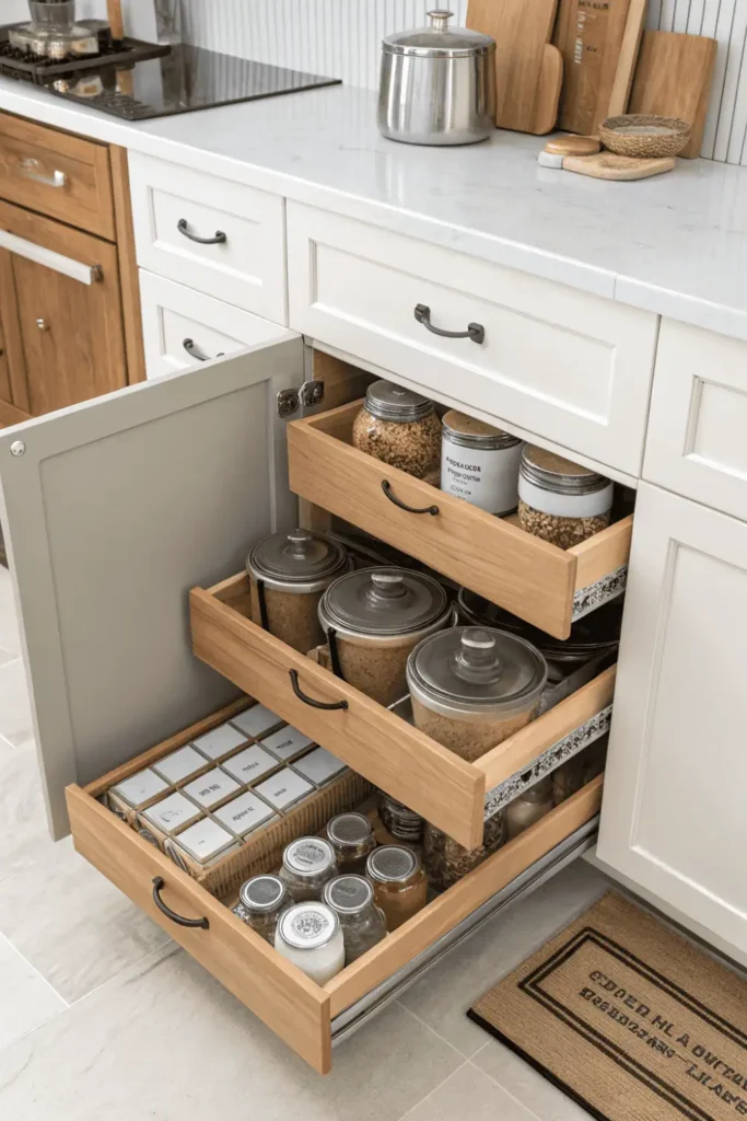 Features like deep drawer organizers, pull-out spice racks, and dedicated appliance garages eliminate countertop clutter and streamline your workflow. Soft-close hinges and full-extension drawers add luxury and durability.