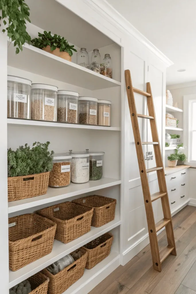 Categorized zones for baking supplies, snacks, canned goods, and small appliances make meal prep efficient and enjoyable. Consider adding a countertop workspace for coffee stations or additional prep areas.