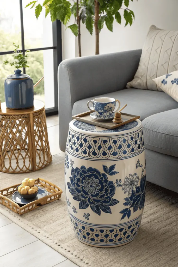 Traditional motifs include dragons, peonies, and geometric fretwork. Garden stools bring elegant ethnic home decor that works indoors or outdoors in any design style from traditional to contemporary.