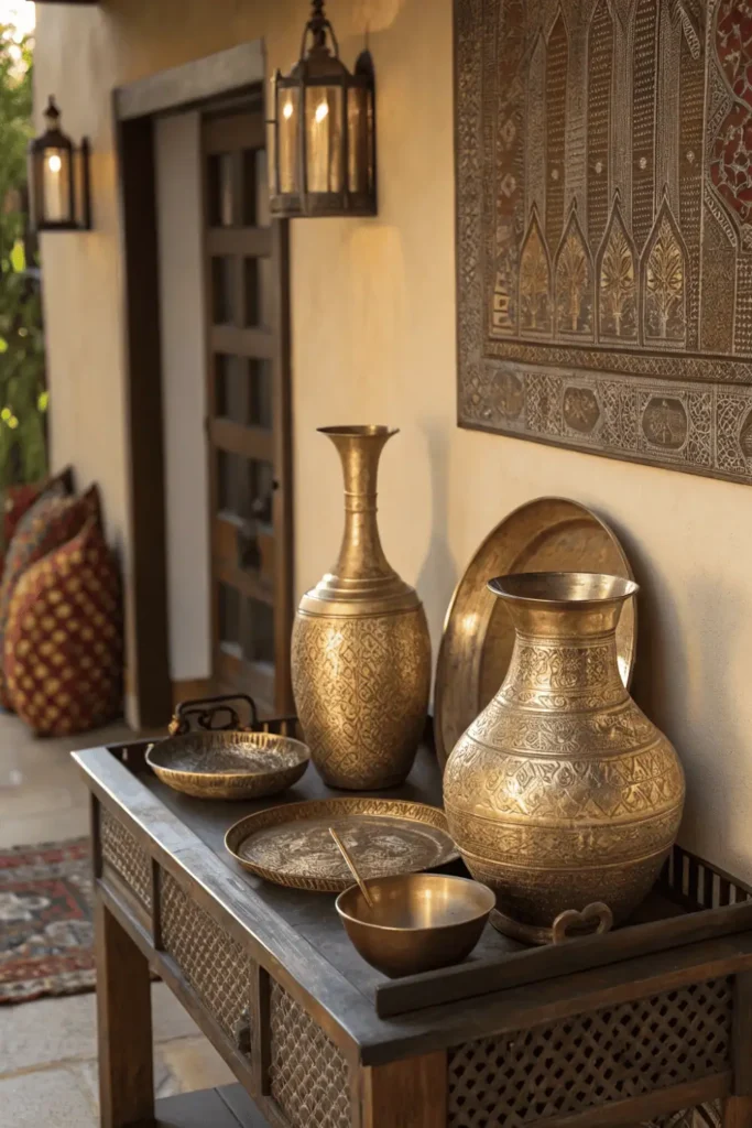 Brass and copper vessels from India include ornate pots, urns, and decorative trays with embossed patterns and hammered finishes. These metallic pieces add warm, reflective ethnic home decor elements.