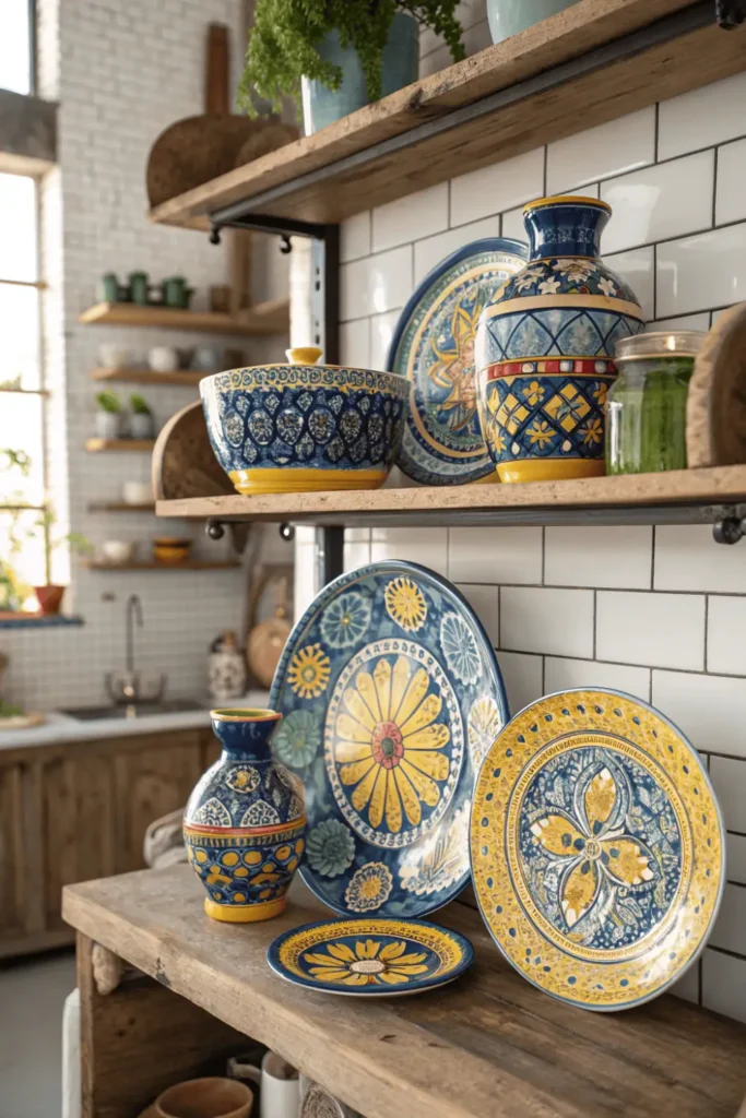 Talavera pottery from Puebla, Mexico features hand-painted ceramic pieces in brilliant blues, yellows, greens, and whites. These decorative plates, vases, and bowls add cheerful Mediterranean flair to kitchens and dining areas.