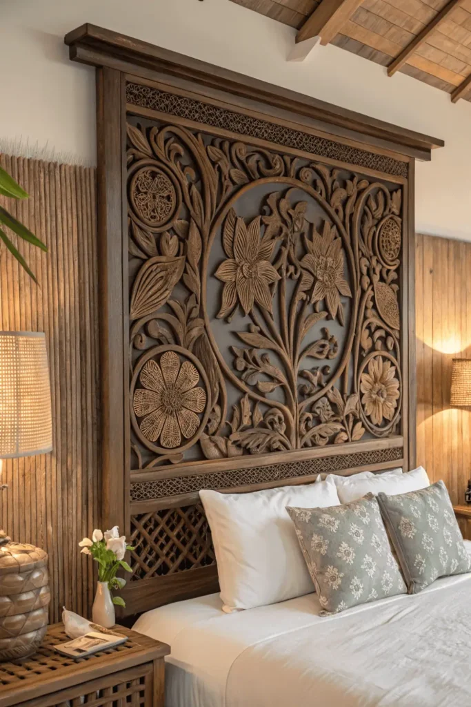 Hand-carved teak or mahogany panels add textural dimension and cultural richness. Traditional Balinese craftsmanship creates depth through layered relief carving techniques passed through generations.