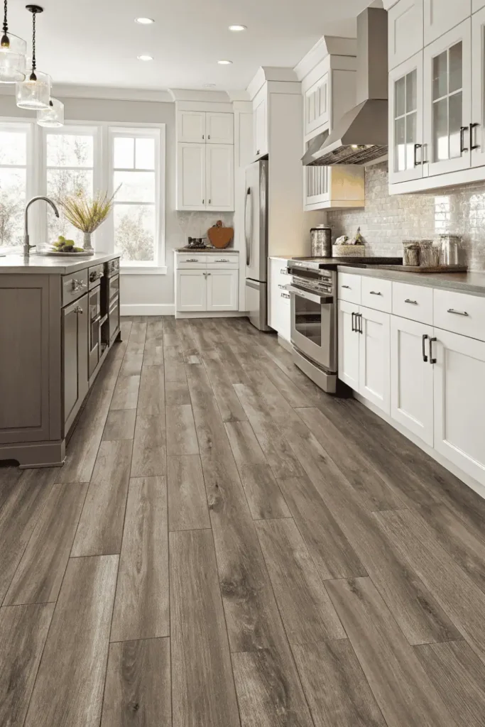 Luxury vinyl plank (LVP) flooring offers the appearance of hardwood at a fraction of the cost with superior water resistance for kitchens. This kitchen remodel choice withstands spills, dropped dishes, and heavy traffic while requiring minimal maintenance.