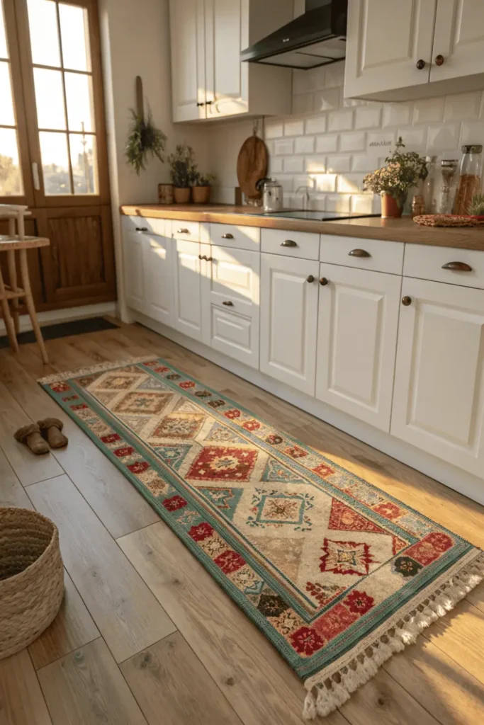 Kitchen rugs introduce softness, color, and pattern that make cozy kitchen floors more comfortable and inviting. Vintage-inspired Persian or Turkish patterns add Old World charm while protecting floors and reducing fatigue during long cooking sessions.