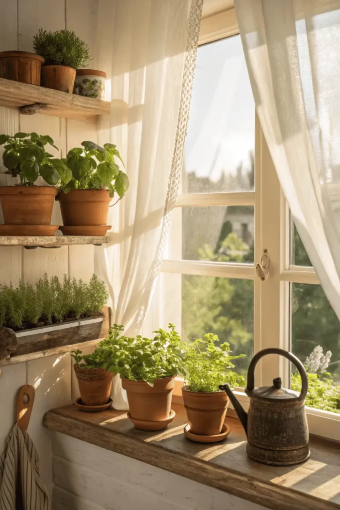 Pinterest Image Prompt: A cozy kitchen window filled with potted herbs in terracotta pots, morning sunlight streaming through, white curtains, wooden shelves with more plants, vintage watering can, warm golden light, vertical 2:3 ratio, fresh organic aesthetic