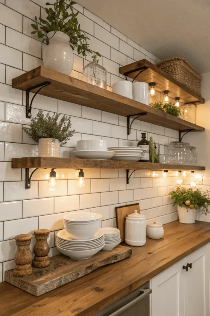 Open wooden shelves replace upper cabinets in a cozy kitchen, creating an approachable, lived-in feel. Displaying everyday dishes, glassware, and vintage finds adds personality while keeping essentials within easy reach.
