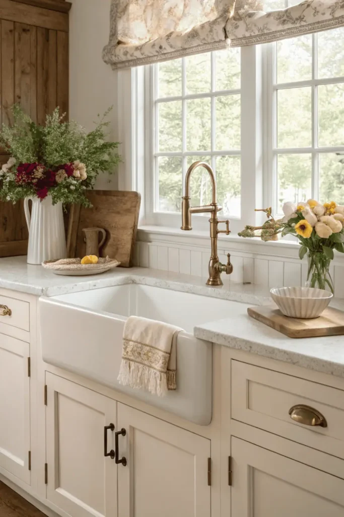 Pair your farmhouse sink with a vintage-inspired bridge faucet in oil-rubbed bronze or brushed brass. These classic fixtures add authenticity and warmth that modern chrome alternatives can’t match.