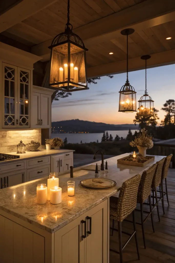Under-cabinet LED strips illuminate work surfaces while adding soft, indirect light that enhances coziness. Pendant lights over islands or tables serve as both functional task lighting and decorative focal points.