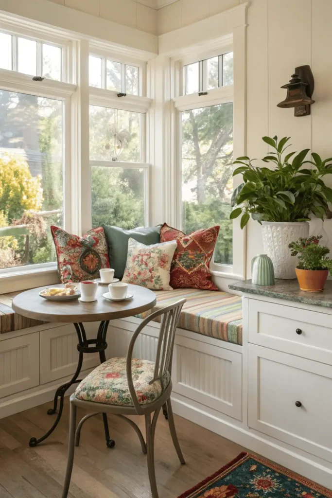 A built-in window seat creates the ultimate cozy gathering spot in your kitchen. Cushioned benches with throw pillows invite lingering over morning coffee or casual meals while enjoying natural light and views.