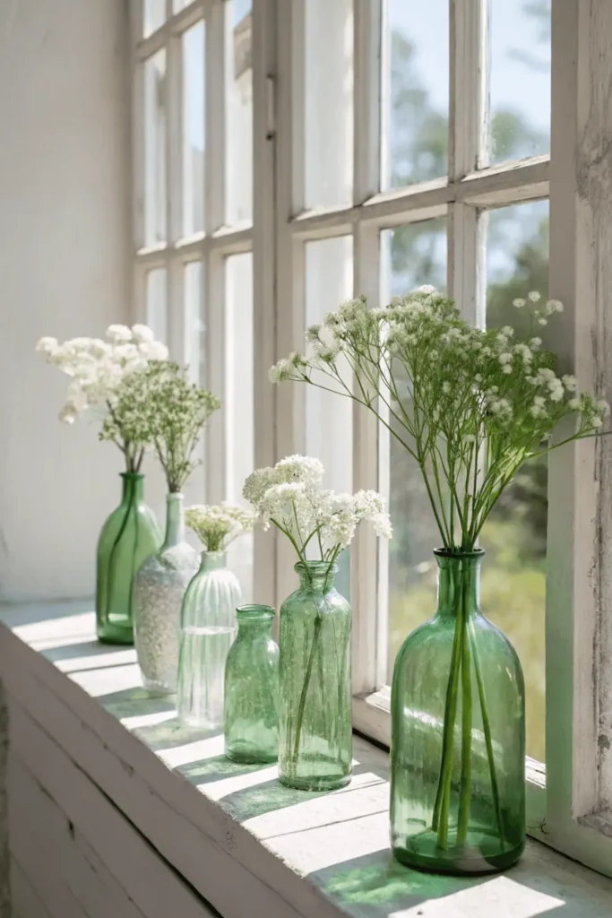 Green glass vases, bottles, and decorative objects add translucent color that glows beautifully when light passes through. Cluster several green glass pieces together on shelves, mantels, or windowsills for affordable green home decor with vintage charm.