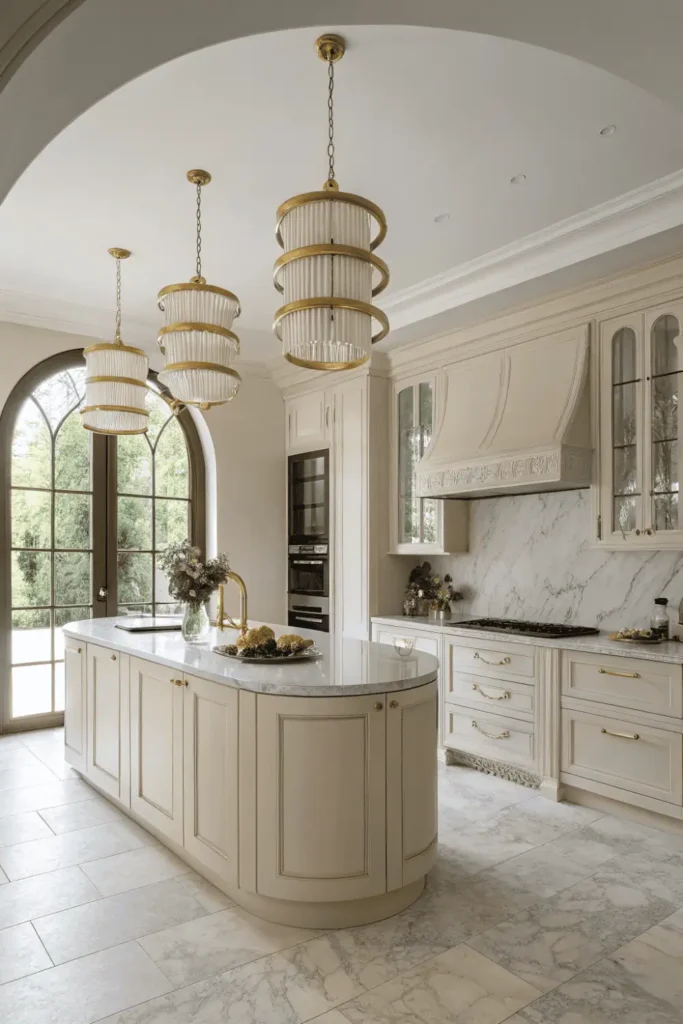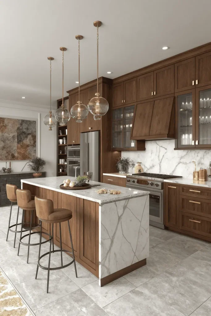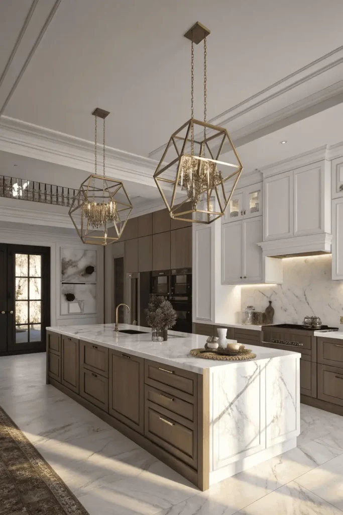 Oversized pendants and sculptural chandeliers serve as functional art in the latest kitchen designs. Dramatic lighting fixtures above islands become conversation pieces that define the entire space’s character.