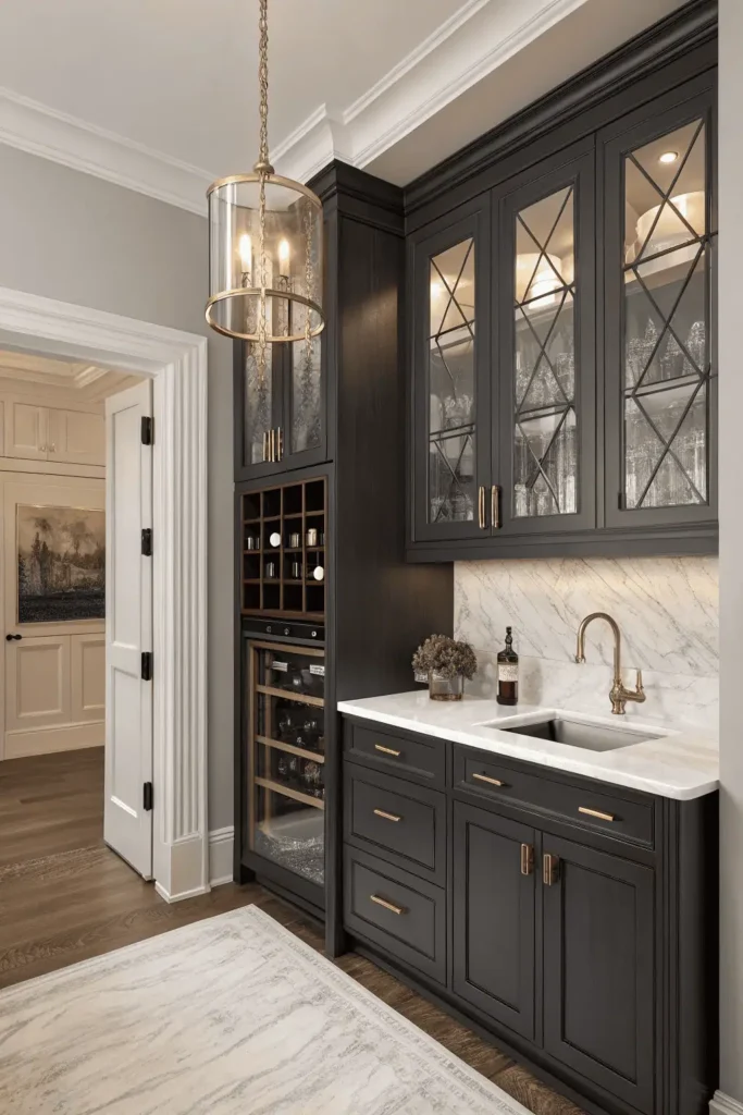 Dark cabinetry pairs beautifully with brass or gold hardware, white marble countertops, and strategic lighting to prevent spaces from feeling too heavy. The moody aesthetic appeals to design-forward homeowners embracing maximalism.