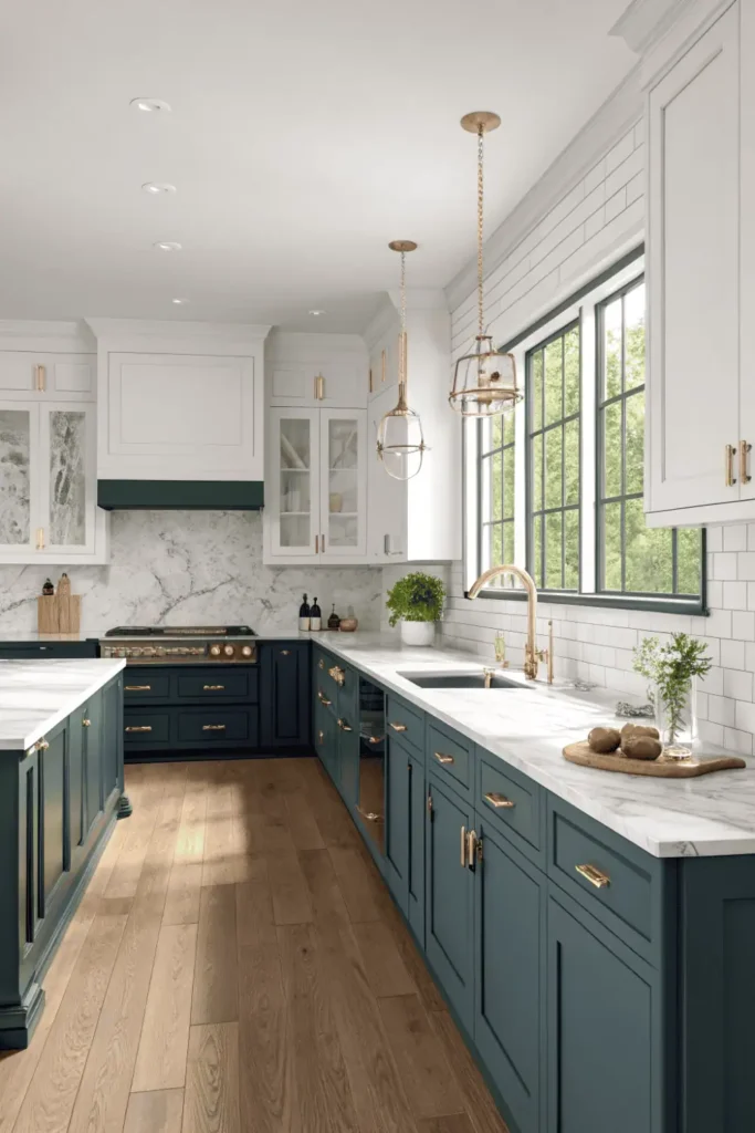 Pro Tip: Choose your dominant color for lower cabinets since they occupy more visual space, and use the accent color on uppers or the island for perfect balance.