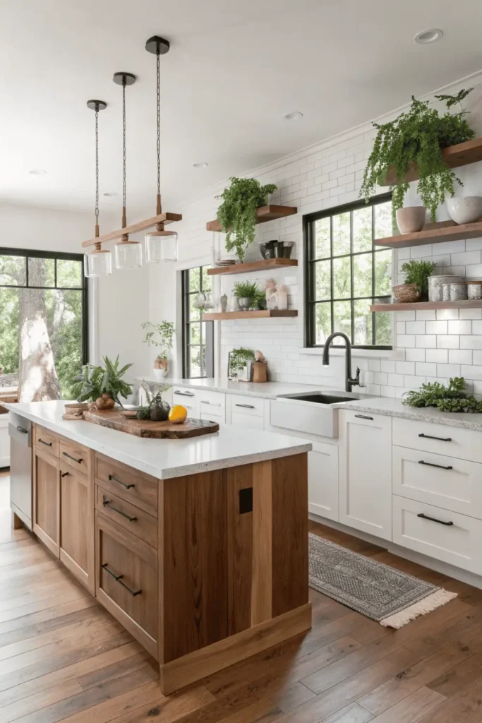 Floating shelves replace upper cabinets in the latest kitchen designs, creating airy, accessible storage for everyday items. This Instagram-worthy trend showcases beautiful dishware, glassware, and decorative objects while maintaining functionality.
