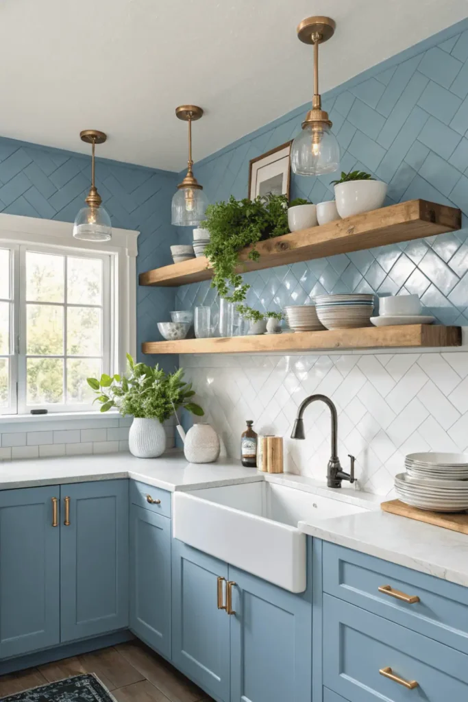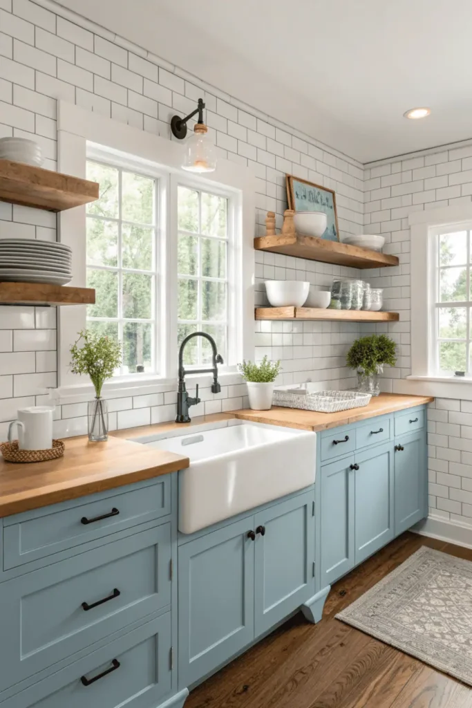 Pro Tip: Powder blue pairs perfectly with white subway tile backsplashes and butcher block countertops for an authentic farmhouse aesthetic that feels collected over time rather than decorated all at once.