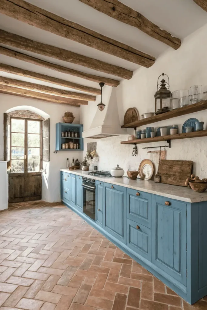Mediterranean blue cabinets in saturated, slightly weathered finishes evoke Greek island aesthetics. This warm-toned blue pairs beautifully with terracotta, bringing vacation vibes into everyday cooking spaces.