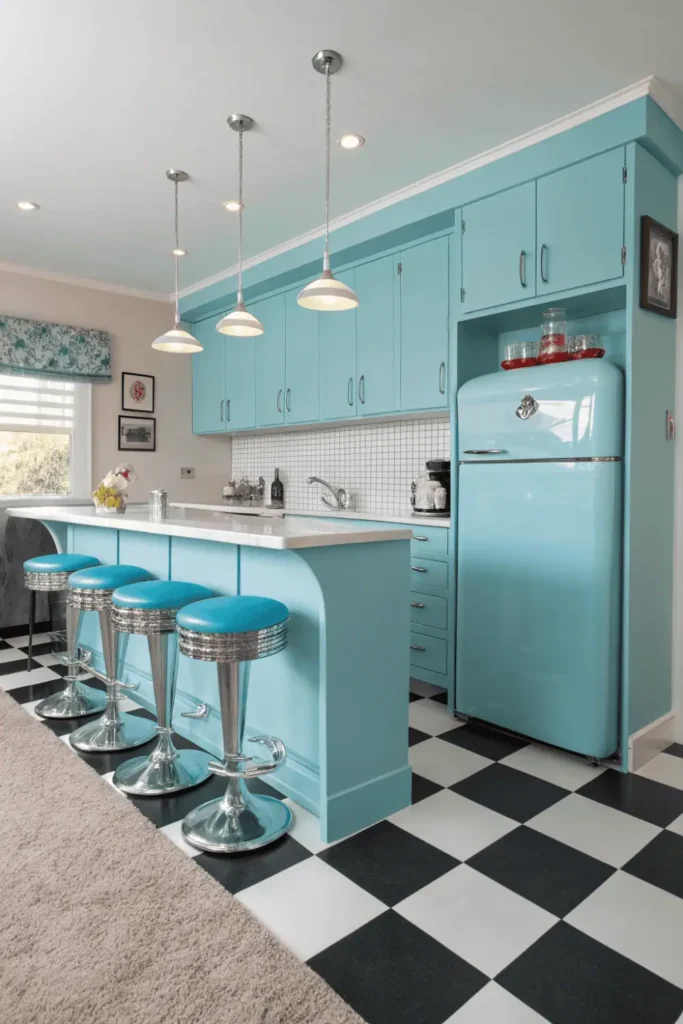 Pro Tip: If going full retro feels too themed, use robin’s egg blue on just the lower cabinets or island and keep other elements more contemporary—this creates charming eclectic spaces that feel collected rather than costume-like.