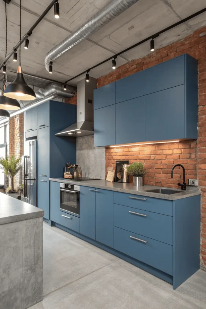 Concrete countertops enhance the industrial aesthetic while providing durable, unique work surfaces. Add exposed brick, metal accents, and Edison bulb lighting to complete the urban loft look.