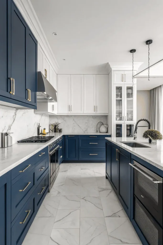 Two-tone cabinetry balances bold color with classic neutrality by pairing blue lower cabinets with white upper cabinets. This approach adds visual interest while preventing color overload in smaller spaces.
