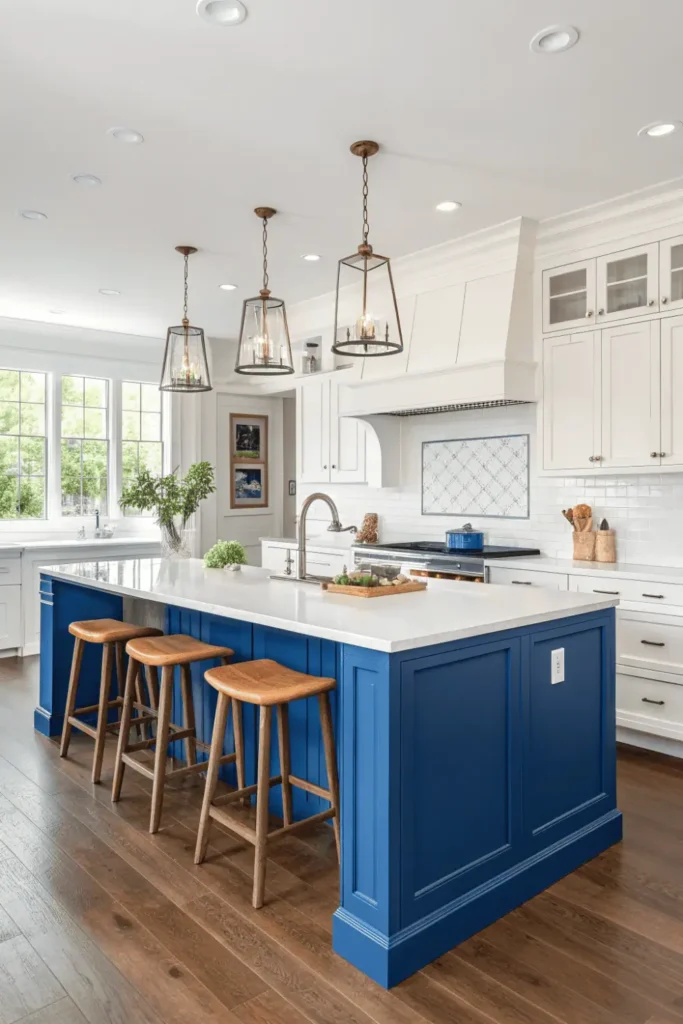 A blue island becomes an instant focal point that anchors the kitchen design. Choose deeper shades like royal blue, teal, or navy for maximum impact against white or cream surroundings.