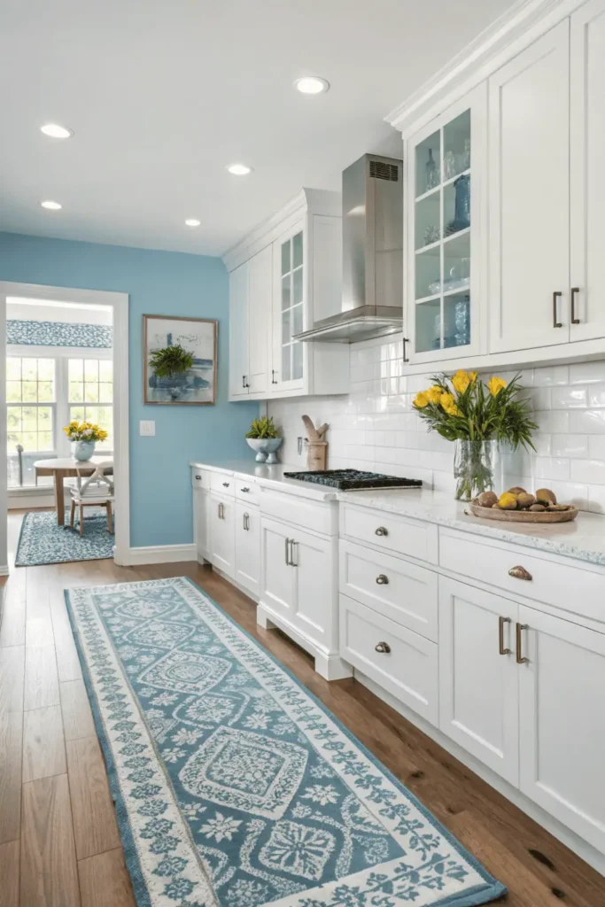 Create a serene blue kitchen by painting walls in soft sky blue while keeping cabinets classic white. This approach provides color impact with less commitment and lower cost than replacing or painting cabinetry.