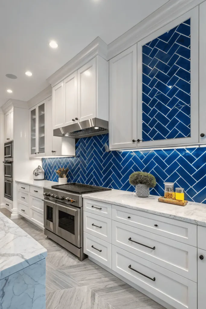 A cobalt blue tile backsplash adds bold personality to neutral kitchens without the commitment of colored cabinetry. Glossy blue tiles catch light beautifully and create stunning focal points behind stoves or sinks.