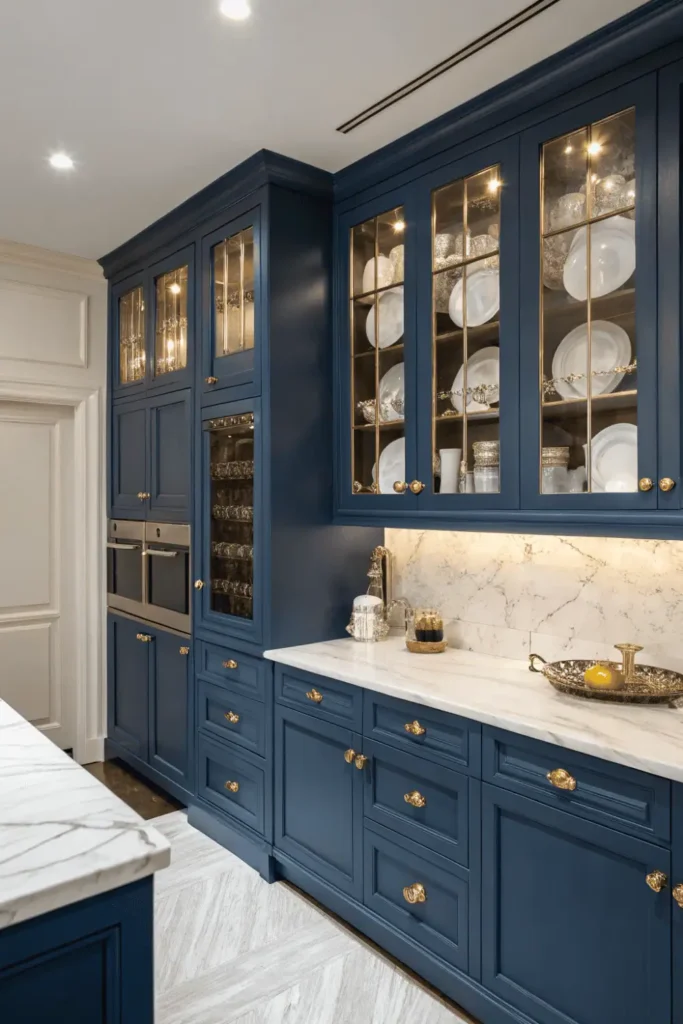 9. Deep Sapphire Blue Lower Cabinets with Glass Uppers