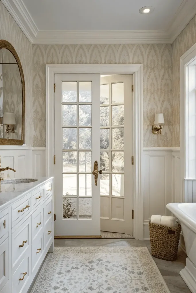This style suits traditional, transitional, and cottage-style bathrooms, particularly in master suites where aesthetic impact matters. The symmetrical design creates a formal, polished appearance that elevates bathroom ambiance.