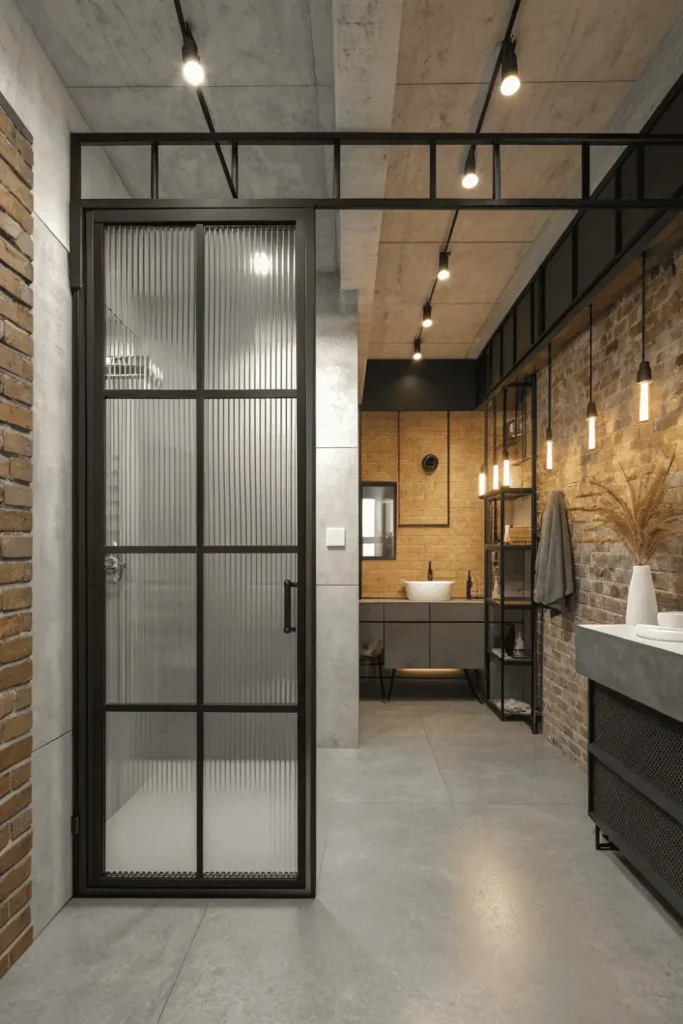 This design bridges contemporary and industrial aesthetics perfectly. The textured glass adds tactile interest and visual depth while the minimal frame keeps the look clean and uncluttered.