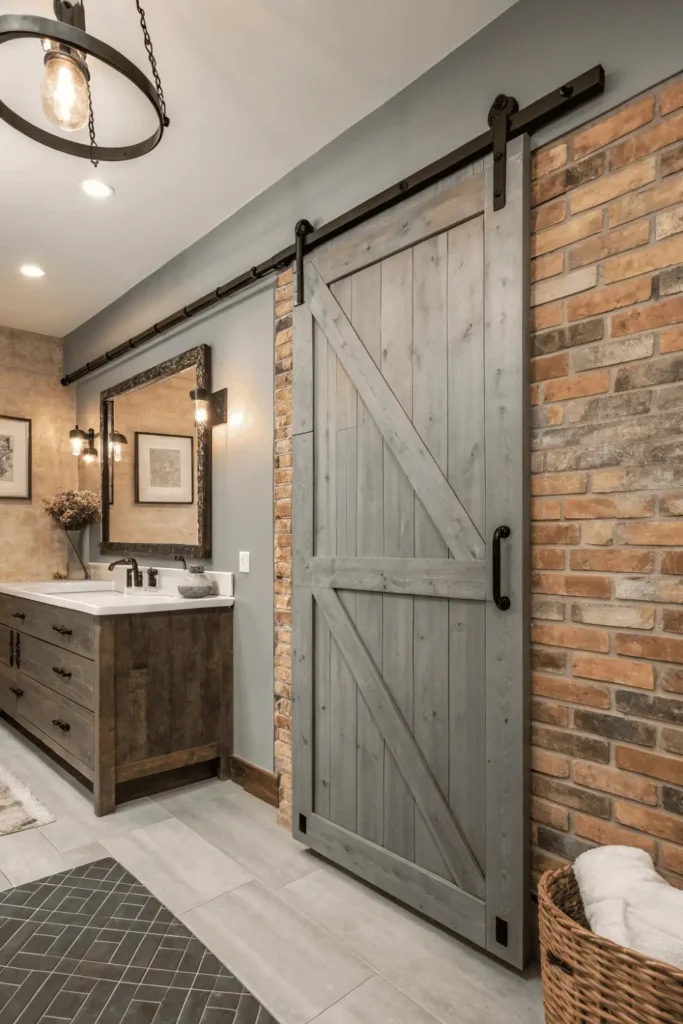 Barn doors bring rustic charm and industrial flair to bathroom spaces. The exposed sliding rail hardware becomes a decorative focal point while the door’s smooth gliding mechanism saves valuable floor space.
