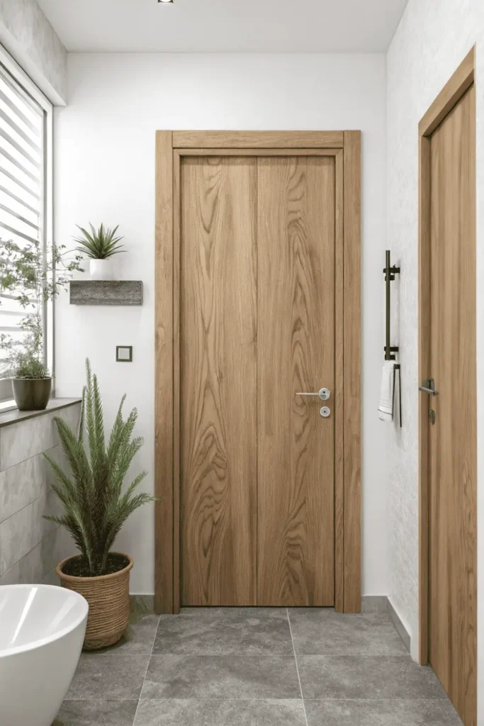 Flush doors present a smooth, flat surface perfect for minimalist and contemporary bathrooms. The laminate finish in wood tones, solid colors, or textured patterns provides durability and easy maintenance.