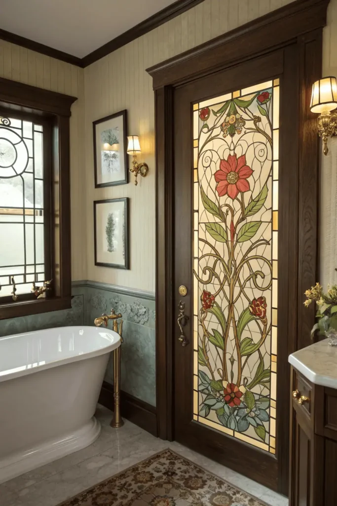 Stained glass doors infuse bathrooms with artistic character and colorful light play. The handcrafted glass panels create privacy while casting beautiful colored shadows throughout the day.