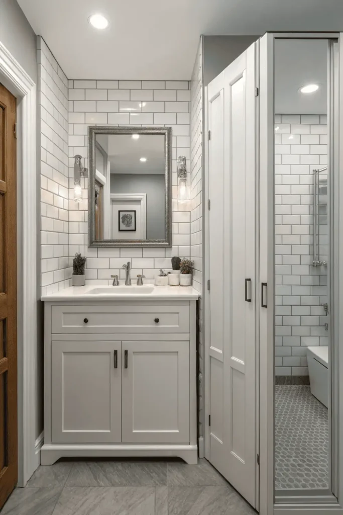 Bi-fold doors fold inward, requiring only half the swing space of traditional doors. The mirror panels serve dual purposes—reflecting light to make bathrooms feel larger while providing functional full-length mirrors.