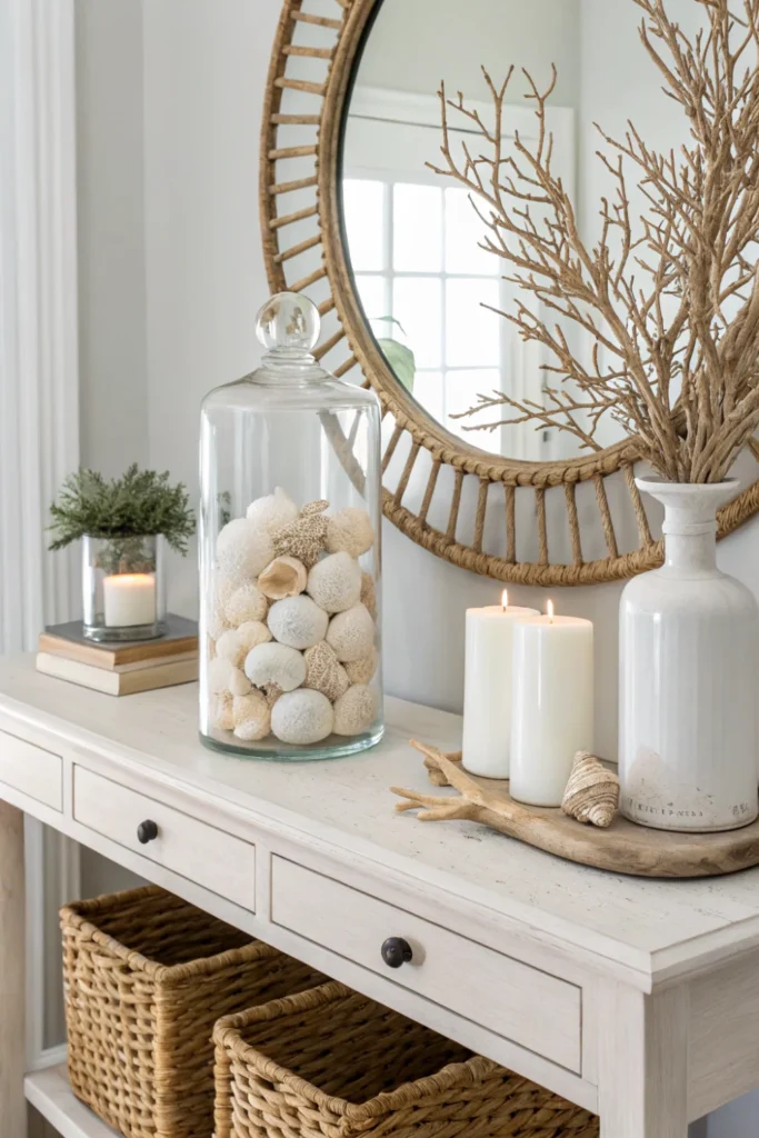 Arrange shells in glass apothecary jars, shadow boxes, or glass bowl centerpieces for museum-quality presentation. Large statement pieces like conch shells or coral branches work better than many small items scattered throughout.