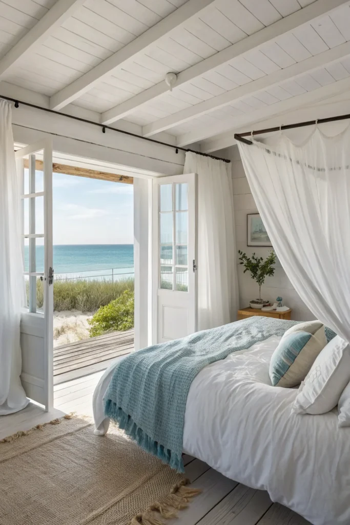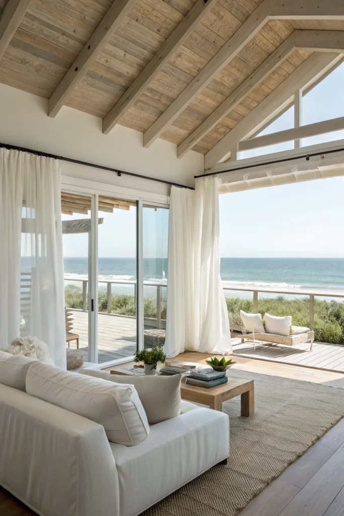 Choose lightweight linens, cotton gauze, and sheer voiles for curtains, bedding, and upholstery that flutter in ocean breezes and maintain that effortless beach house decor aesthetic. These breathable fabrics keep spaces cool and comfortable while adding soft, romantic movement.
